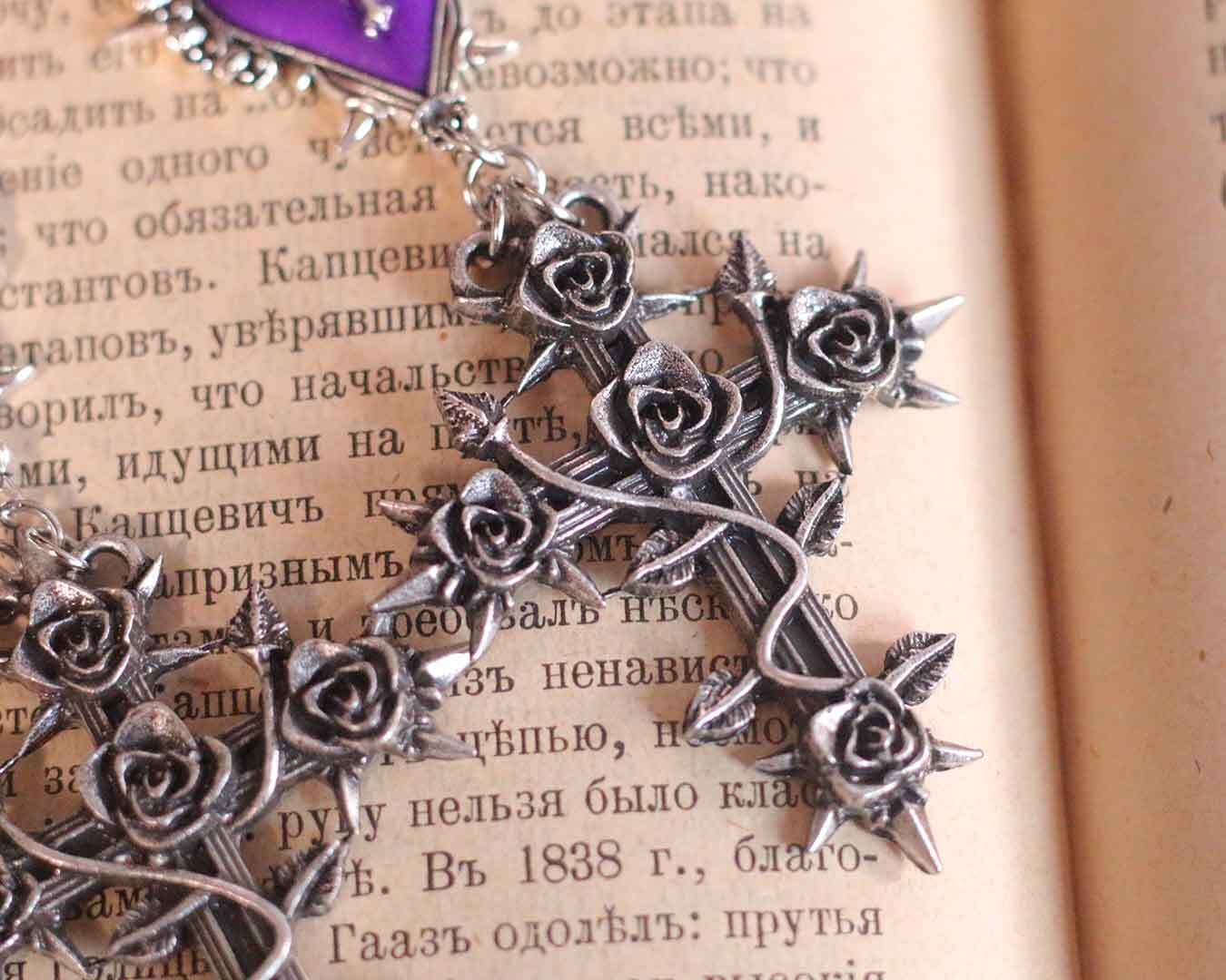バラが絡まったごつめな十字架とゴシックなハートを組み合わせた大振りな耳飾りです。
