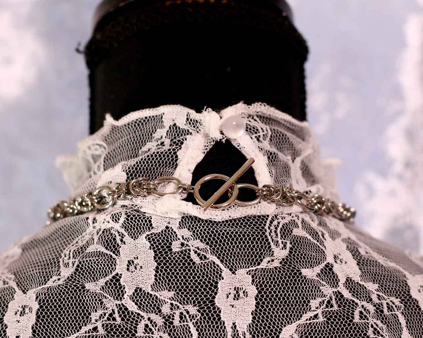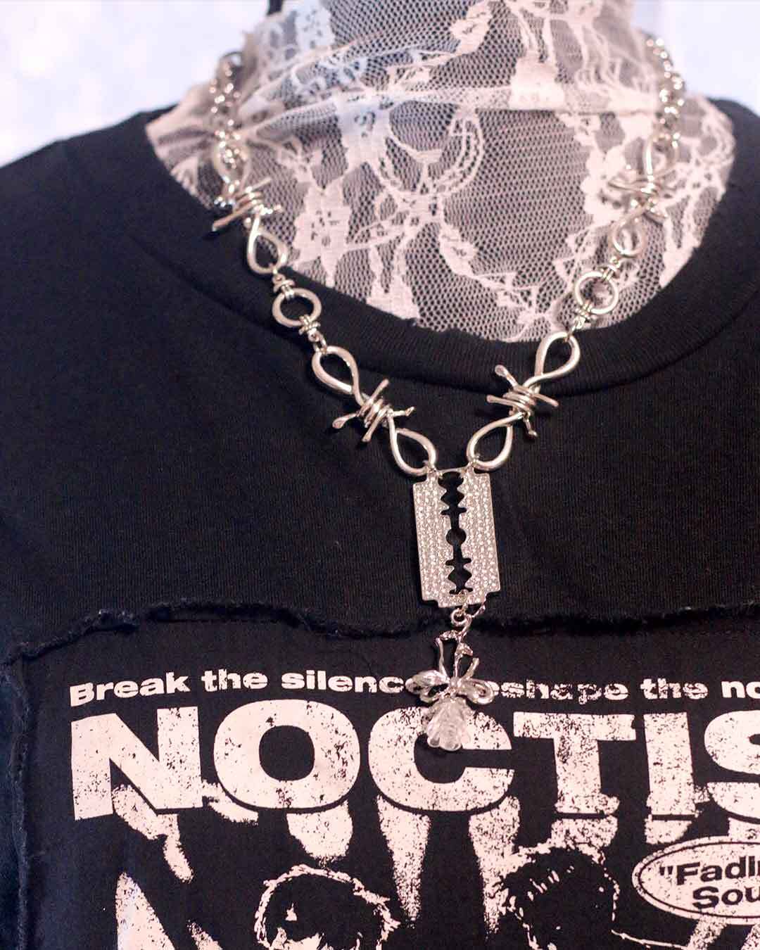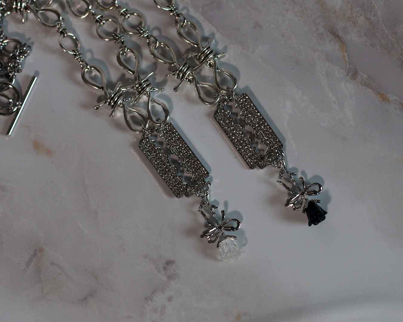 キラキラのカミソリ風パーツとバラのパーツを組み合わせたハードなデザインのネックレスです。マンテルという付け外しがしやすい金具を使用しています。