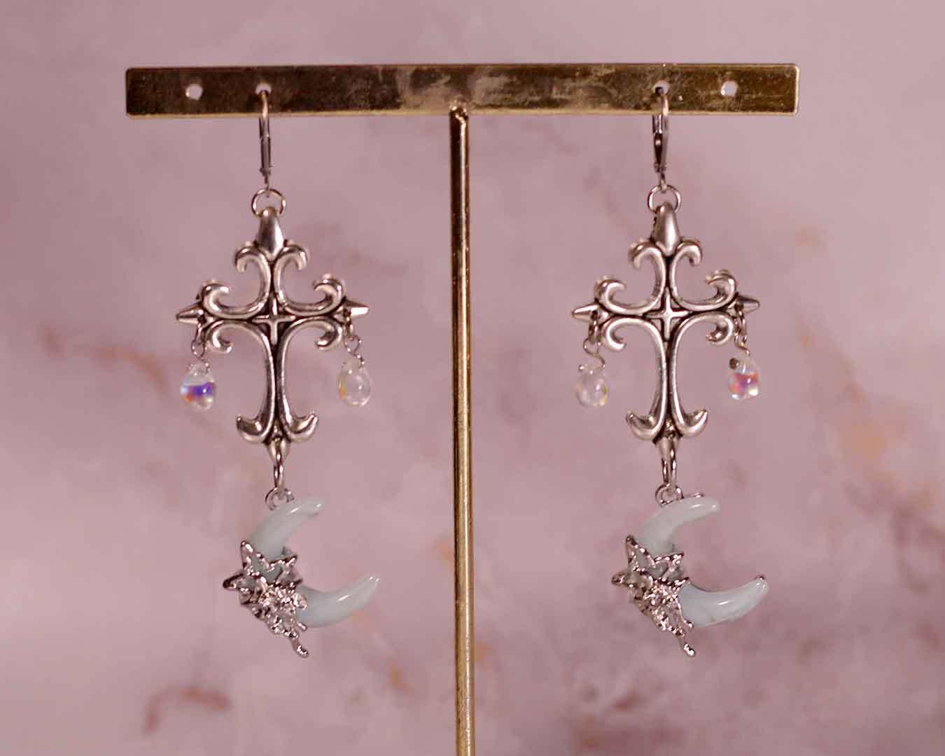 月のパーツと十字架のパーツを組み合わせた耳飾りです。