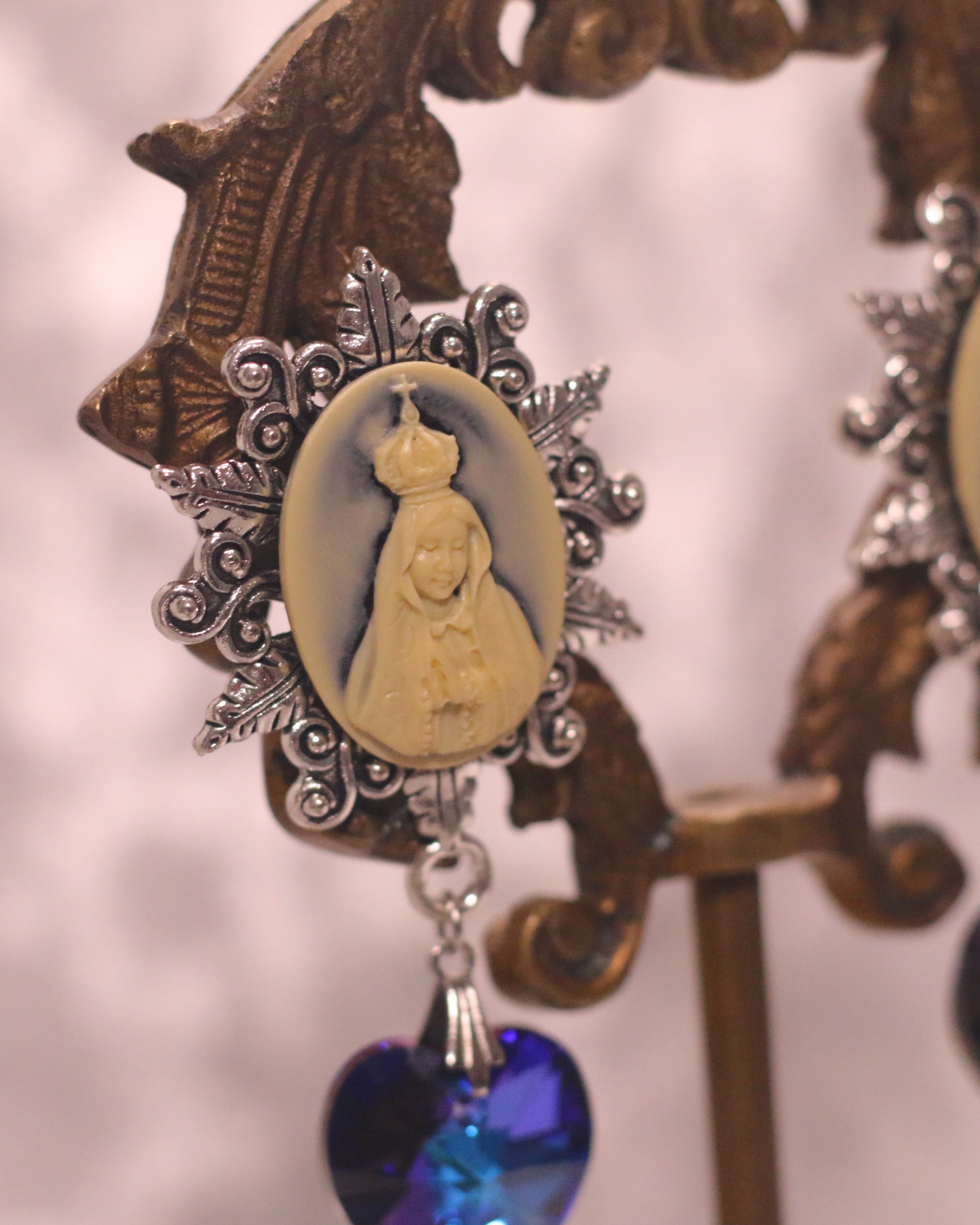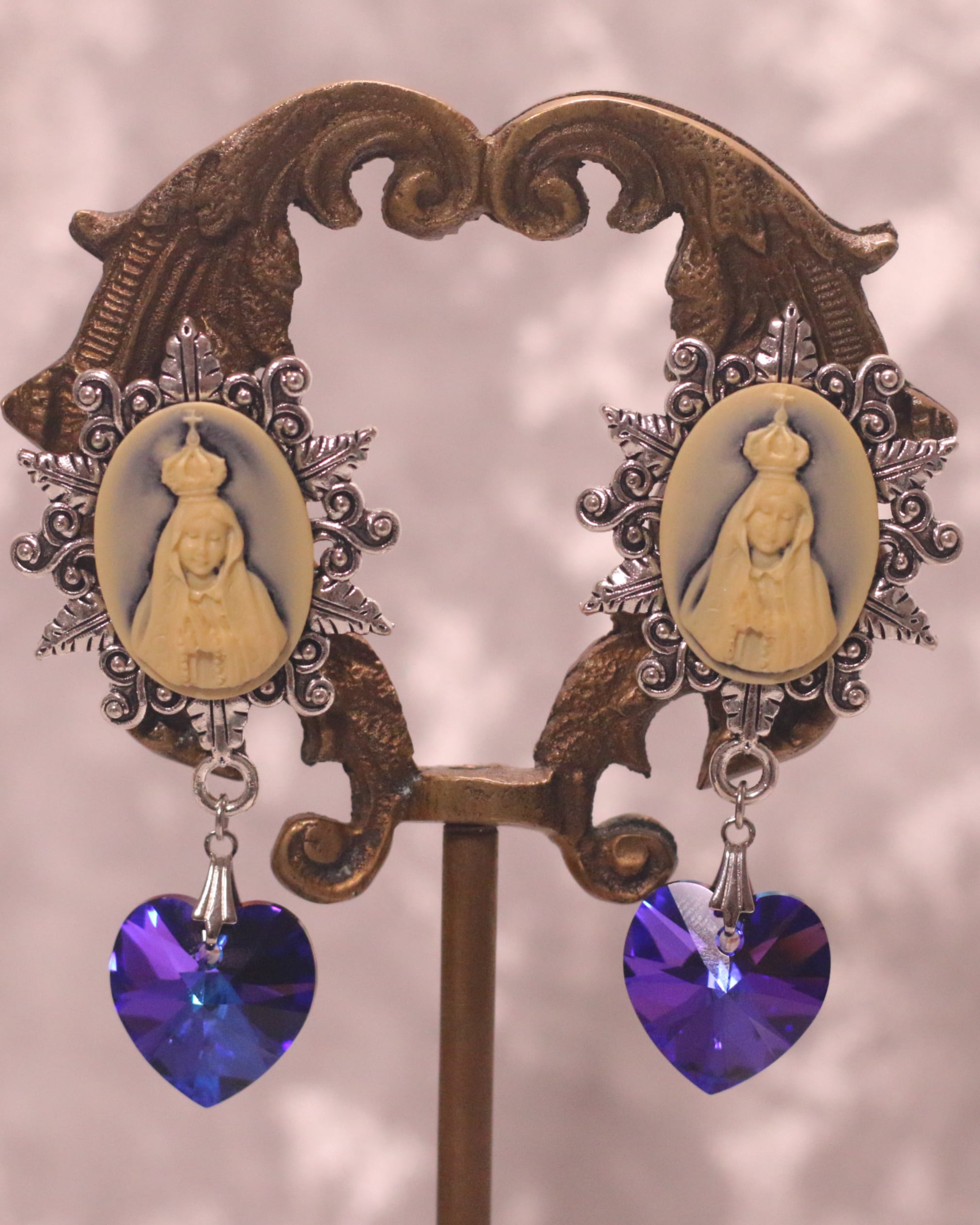 クラシカルな聖母モチーフと、深い輝きを放つハート型ビジューが揺れる耳飾り。