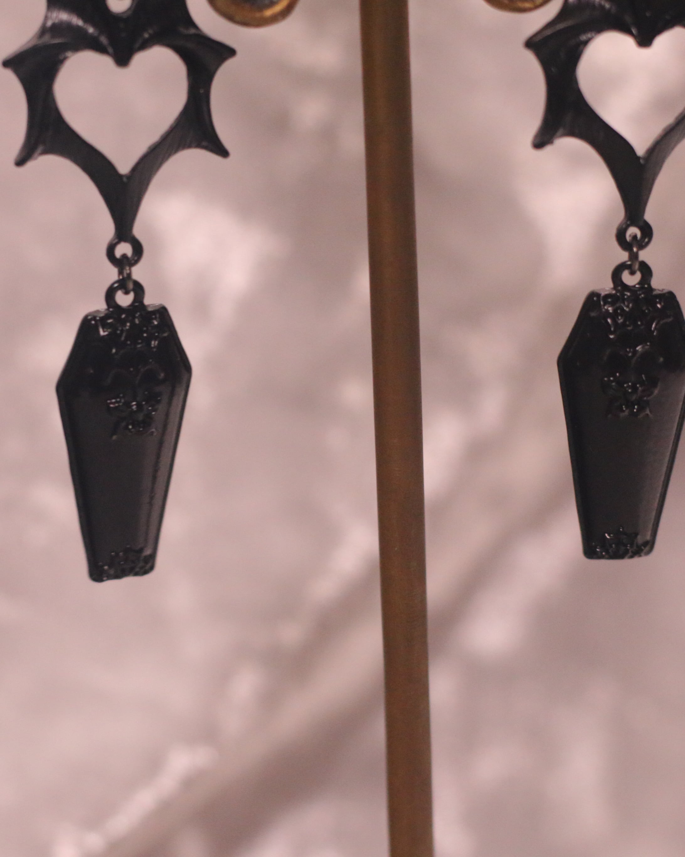 ハート型のコウモリパーツと小さな棺桶チャームが揺れて、ダークロマンチックな世界観に仕上げました。