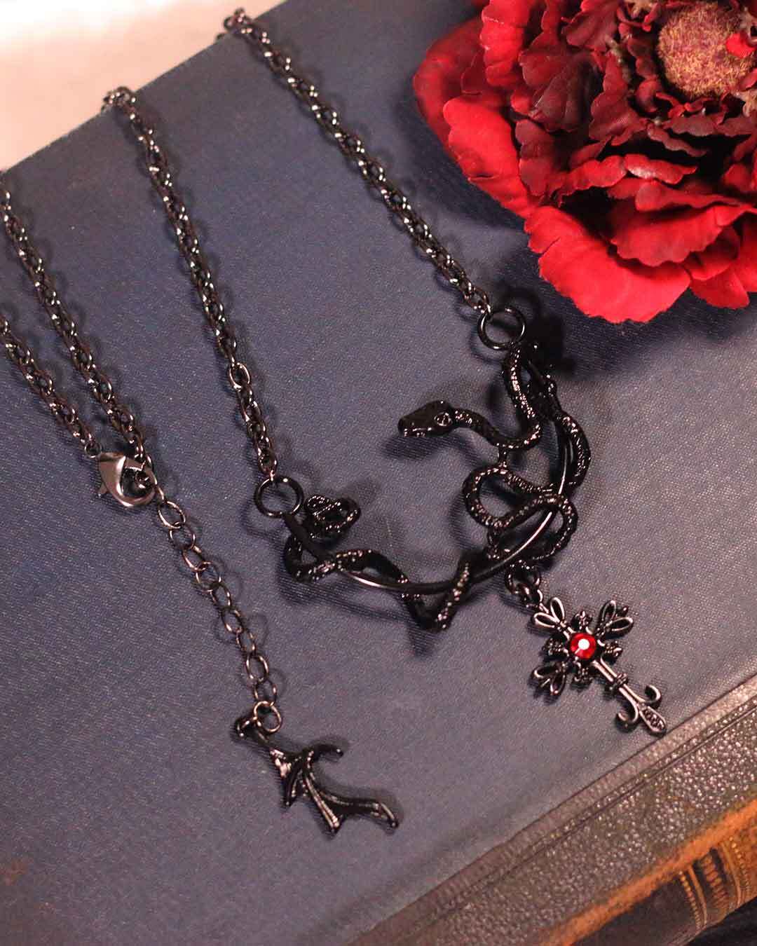 闇に潜む蛇が静かに絡みつくような、妖艶で神秘的なデザインのロングネックレス。