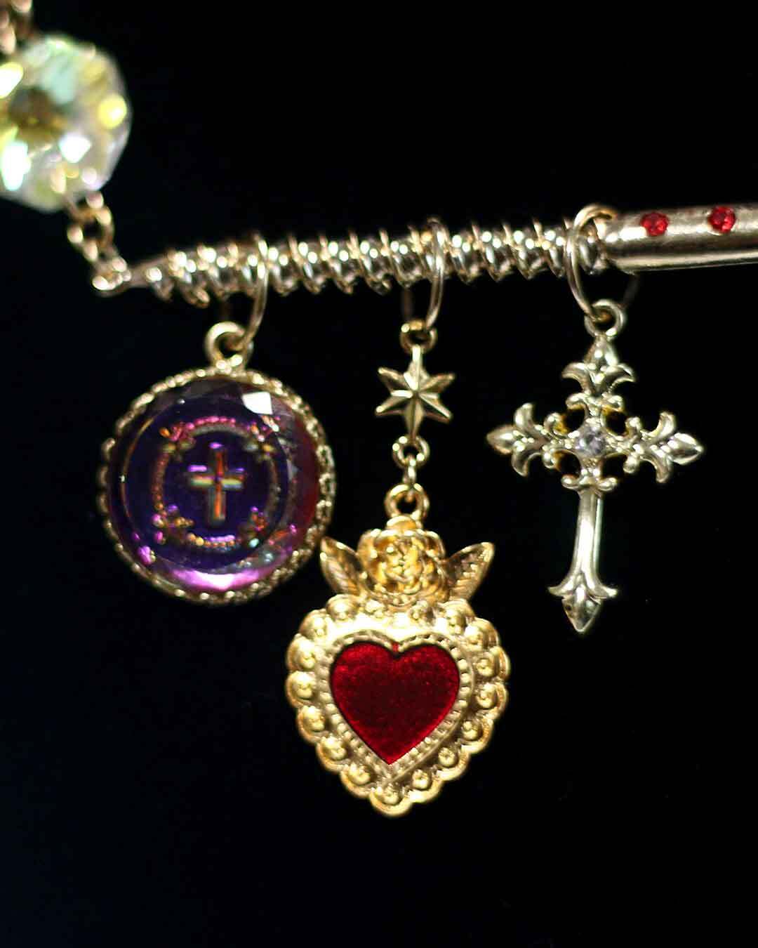 大きなネジモチーフを中心に、ハート・クロス・星などのチャームが揺れ、個性的ながらも華やかに胸元を飾ります。