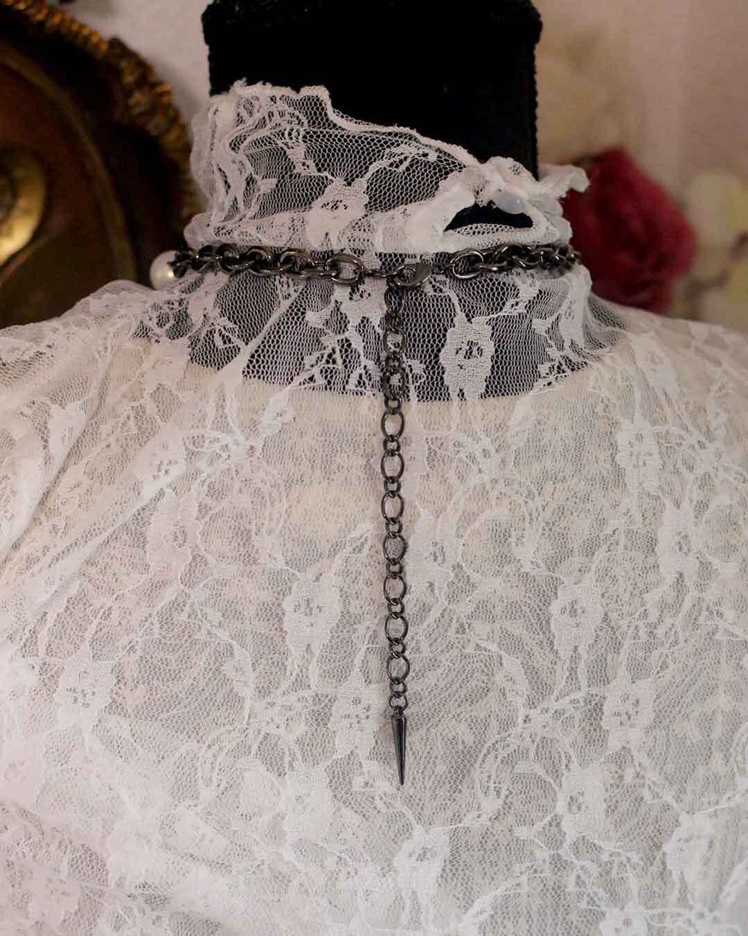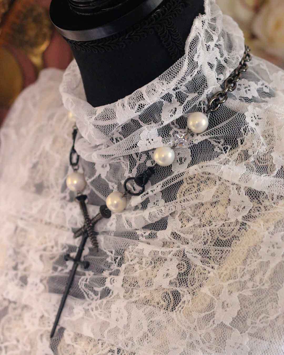 ネジモチーフのクロスと剣のチャームが印象的で、上品さの中に少しハードな雰囲気をプラスします。