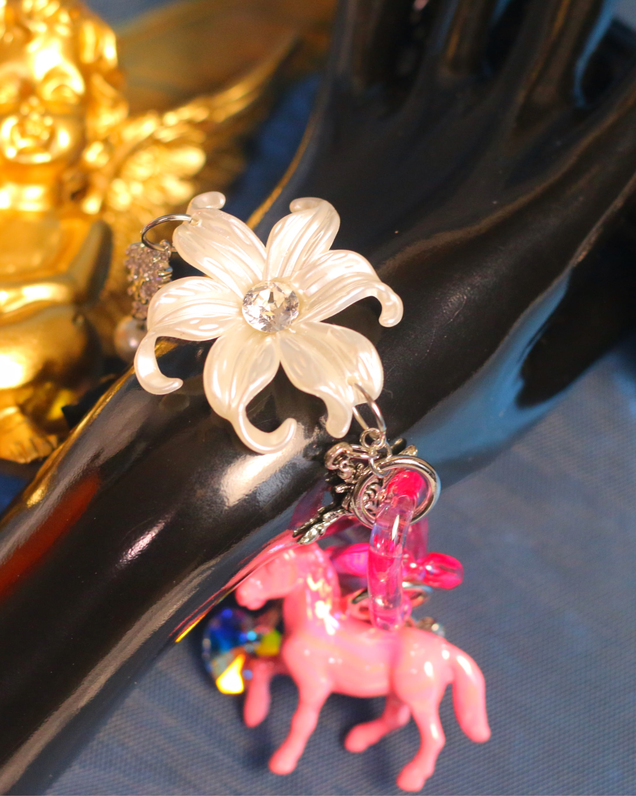 フラワーやリボン、ユニコーンのモチーフにピンクのクリアチェーンを合わせ、