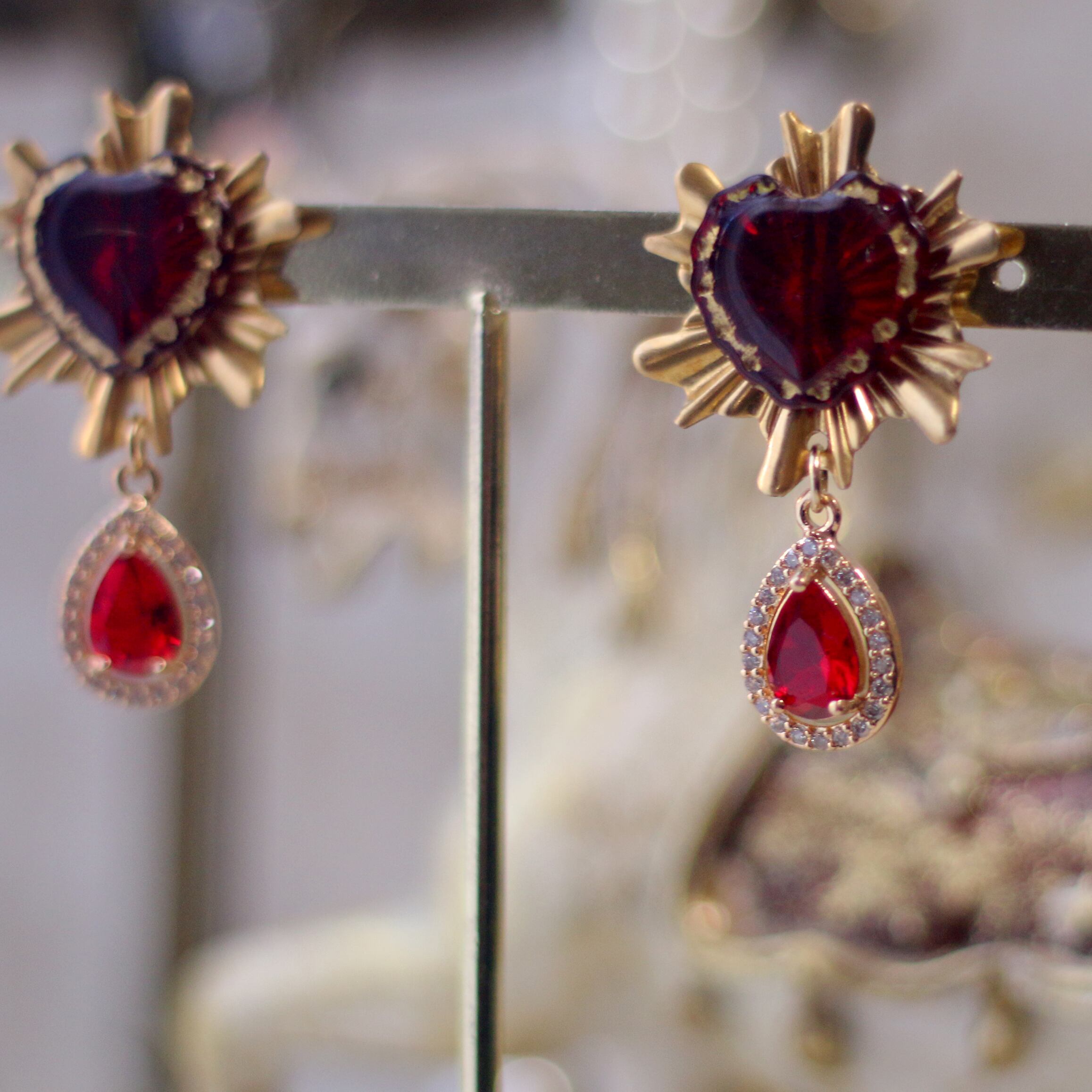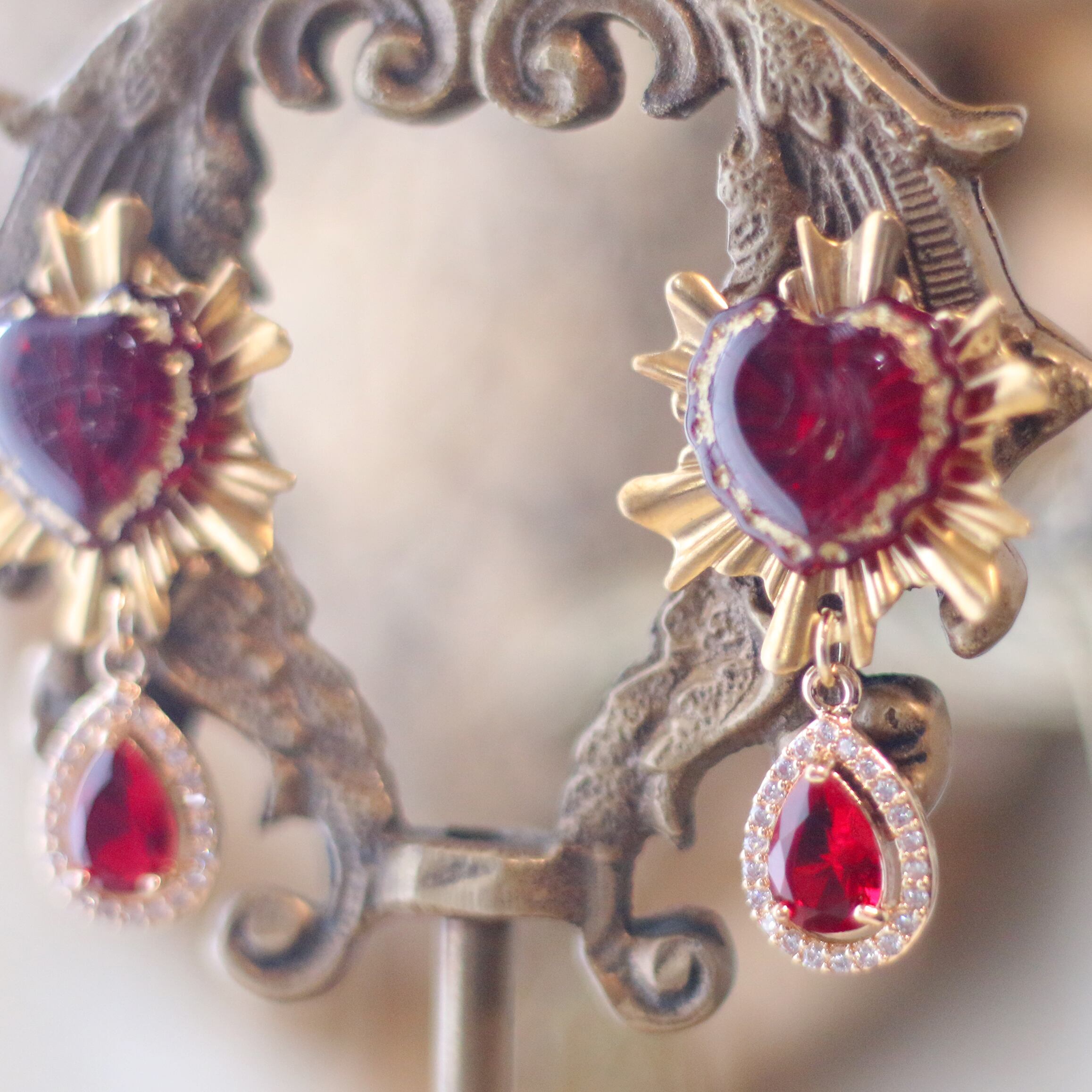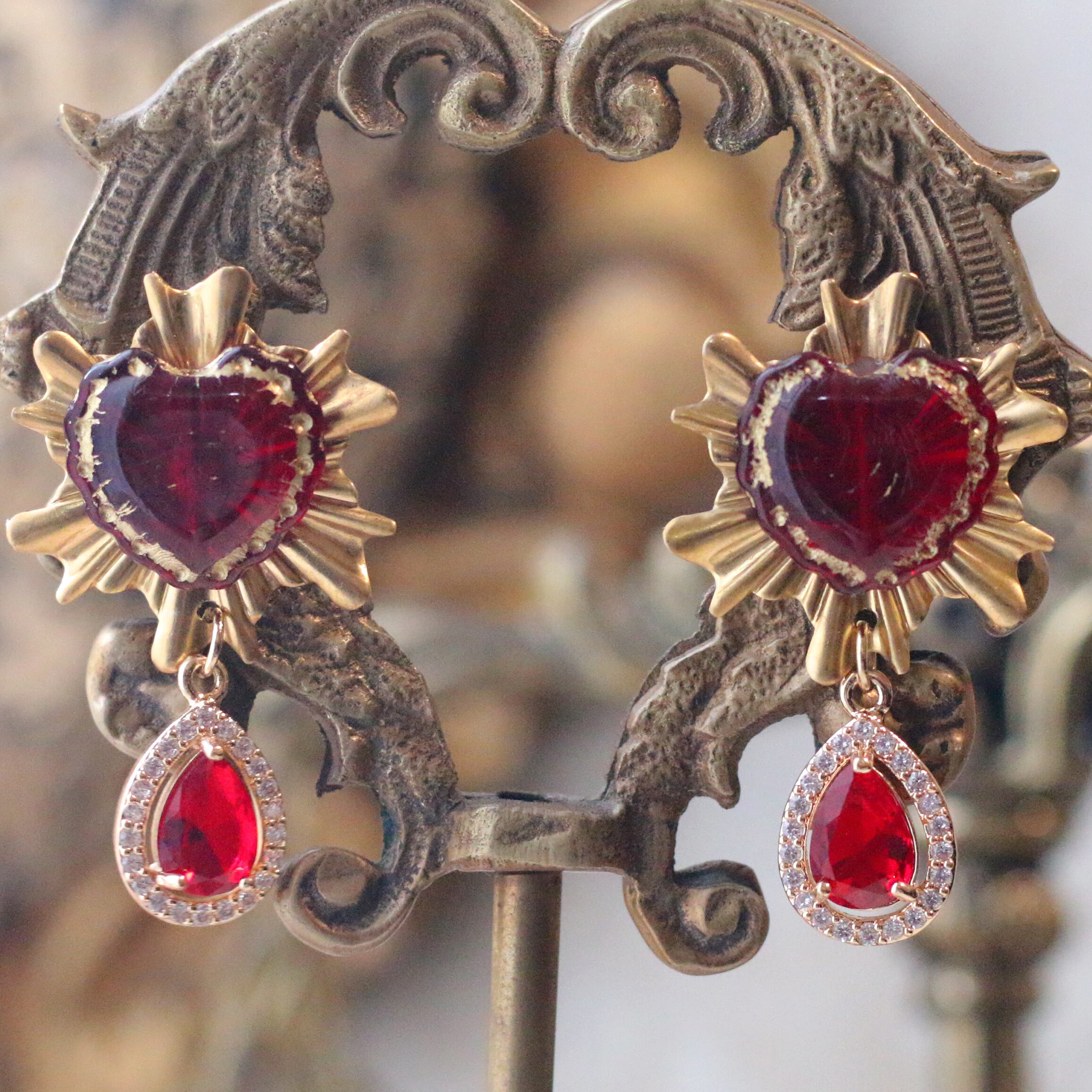 ハートのチェコビーズと真鍮パーツを組み合わせた耳飾り。