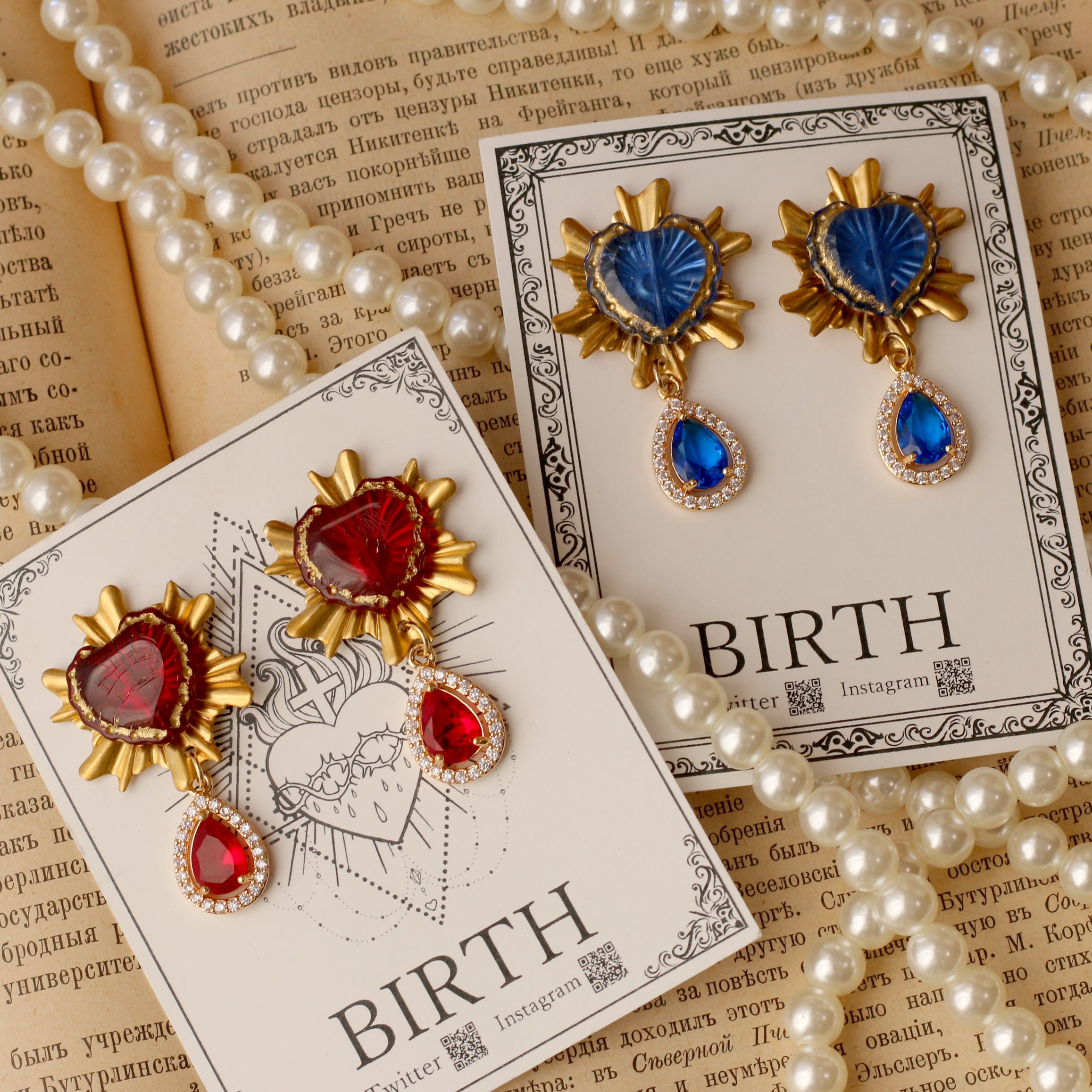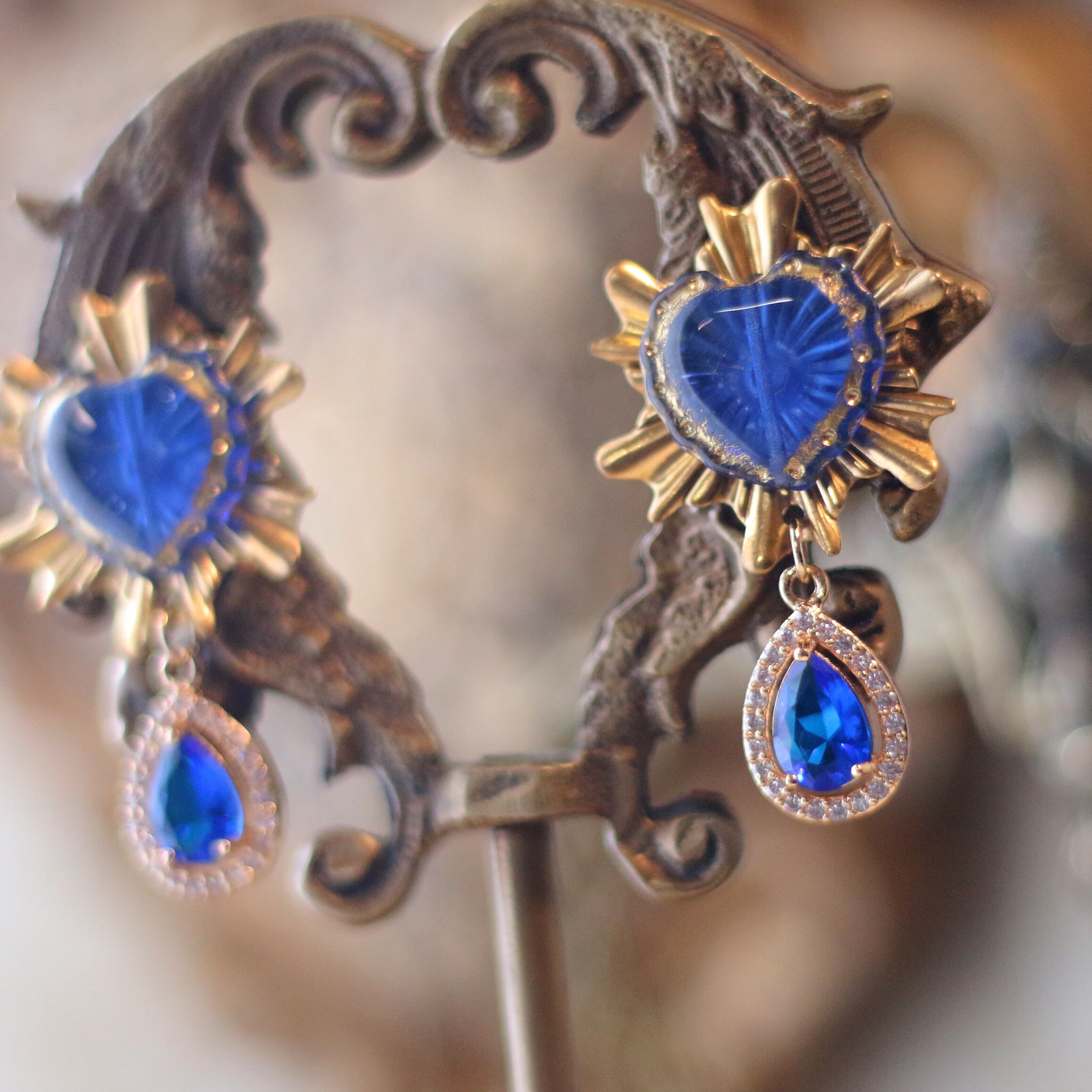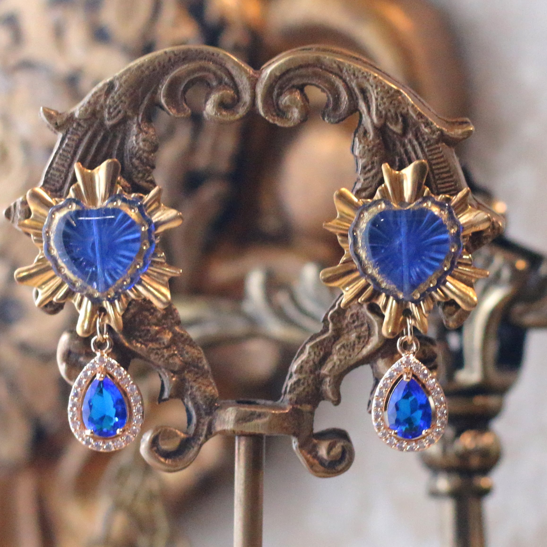 ハートのチェコビーズと真鍮パーツを組み合わせた耳飾り。